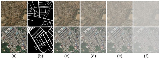 Samples of the generated hazy RS images from the DeepGlobe dataset []. (a) Clear image. (b) Ground truth road mask of image (a). (c–f) are the four generated hazy images of different densities defined as slightly hazy, moderately hazy, highly hazy, and extremely hazy, respectively.