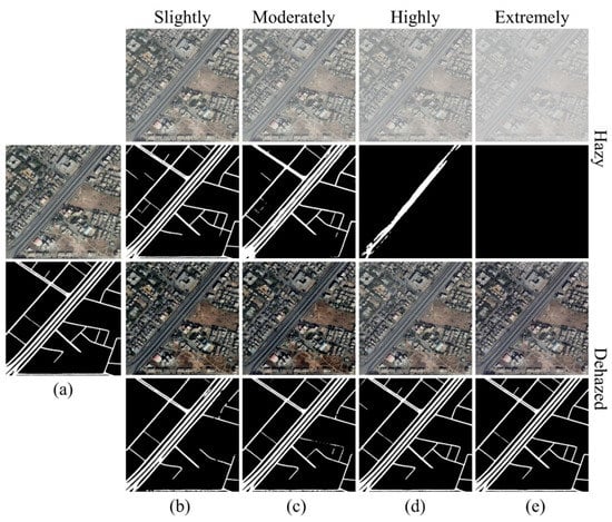 D-LinkNet [] road extraction results using the dehazed images by the proposed dehazing method, where (a) is the reference clear image and the corresponding road extraction result. The first and second rows of (b–e) are the hazy images of different densities and the corresponding road extraction results. The third and fourth rows of (b–e) are the dehazed images by our proposed method and the corresponding road extraction results.
