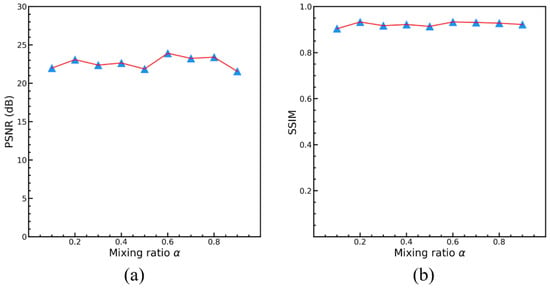 Testing results on the HSTS dataset [] with different mixing ratios (α). (a) Results of PSNR. (b) Results of SSIM.