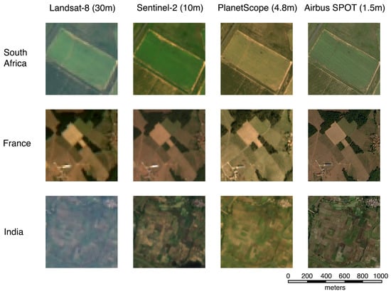 The first major challenge to smallholder field delineation is the availability of satellite images at high enough resolution to see field boundaries. Figure 1 compares the appearance of fields in South Africa, France, and India in imagery taken by Landsat-8, Sentinel-2, PlanetScope, and Airbus SPOT satellites. Field boundaries in South Africa and France can be seen clearly in Landsat-8 (30 m) and Sentinel-2 (10 m) imagery, but smallholder fields in India require PlanetScope (4.8 m) or Airbus SPOT (1.5 m) imagery to be resolved (Figure 1). Historically, very high resolution satellite imagery was expensive to access and available only for a fraction of the Earth’s surface. Only recently has the cost of access been reduced either via the launch of cubesats (PlanetScope) or user-friendly integration of high resolution basemaps (Airbus SPOT) in cloud-based platforms like Descartes Labs. Geographic coverage has also expanded as more satellites have been launched and data storage has become cheaper. Two recent data developments are particularly notable: first, Planet partnered with Norway’s International Climate & Forests Initiative to release PlanetScope mosaics across South Asia, Southeast Asia, and Sub-Saharan Africa [34]; and second, Descartes Labs added access to annual global Airbus OneAtlas Basemaps for users of the platform [35,36]. With the increasing accessibility of high resolution satellite imagery, now is the time to investigate their use for smallholder field delineation.