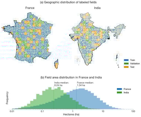 Characteristics of France and India datasets. (a) The locations of labeled fields are plotted as points on maps of France and India. We also visualize how images are split into training, validation, and test sets in geographic blocks. (b) Histograms of field areas on a log x-axis show that France fields are on average 5.6 times larger than India fields.