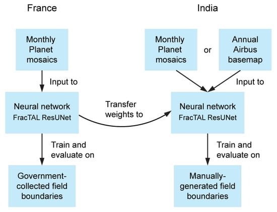 Overview of field delineation experiments. A model is first trained on imagery and field boundary labels in France before being transferred to delineate fields in India.