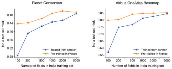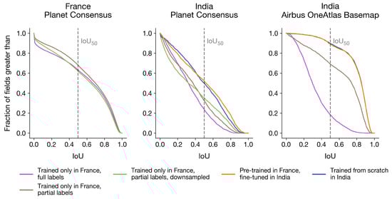In France, we delineated fields using PlanetScope imagery since 4.8m is high enough resolution to clearly separate fields in France. In India, we conducted experiments with both PlanetScope and Airbus SPOT imagery as input, since Indian fields can be extremely small. Airbus SPOT imagery was also downsampled by up to a factor of 3 to approximate PlanetScope image resolution, in order to see whether differences between Airbus SPOT and PlanetScope performance stemmed from PlanetScope being lower resolution.