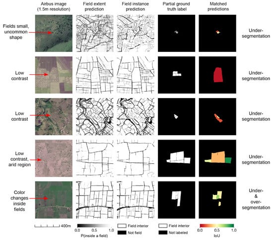 As mentioned in Section 4.2, pixel-level metrics can be difficult to interpret in field delineation when there is class imbalance, evaluation on partial labels, post-processing with the watershed segmentation algorithm, and comparison across satellite imagery of different resolutions. In particular,