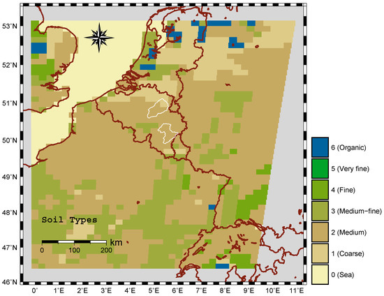 where FC is the field capacity, PWP is the permanent wilting point, SSM is the surface soil moisture index of the SCHEME model and SSM the volumetric soil moisture. The soil data needed for this transformation are provided by the European Centre for Medium Range Weather Forecasts (ECMWF, [34]) in the form of global soil type distribution, together with the field capacity and wilting point corresponding to each soil type. Figure 2 shows the soil types for a larger area around Belgium. There are two soil types inside the Demer catchment and only one inside the Ourthe according to this classification.