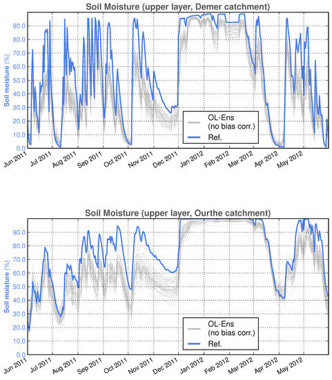 The amount and impact of the latter was elucidated by performing DA-free ensemble runs, hereafter referred to as open loop (OL) simulations. In the OL, the precipitation and SSM perturbations are active but the Kalman equation is disabled. Figure 4 illustrates an example for the areal averaged SSM over the two catchments, Demer and Ourthe, and for one year in OL simulations. Note that, due to areal averaging over the catchments, the reference simulation may sometimes appear completely outside the range of the ensemble (e.g., November 2011), when, in fact, at several places in the catchments, the reference values are inside the ensemble range. The reference simulation is the deterministic SCHEME model run without perturbations or DA.