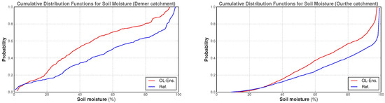 The introduction of SSM bias via ensemble perturbation is a known problem and can be solved by recentering the ensemble around a reference deterministic simulation as in, e.g., [49]. This approach assumes that the ensemble spread is created by adding Gaussian noise only to the model state variables in an ideal case, which is not true here, thus leading us to opt for an alternative solution for perturbation bias correction, which is as follows. We performed OL and reference simulations for the period 2010–2015 for both catchments. We then took spatial averages over the catchments to obtain the reference and the OL ensemble SSM time series. Based on the OL ensemble average and the reference time series, we constructed the cumulative distribution functions (CDFs) for SSM shown in Figure 5.