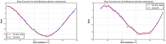 The CDFs can be used to measure the difference between the OL average and the reference soil moisture values at an equal probability. This leads to the soil moisture bias estimates (red lines) displayed in Figure 6, to which, we fitted a polynomial in order to allow for the calculation of a bias correction for any SSM value. In this case, the polynomial was of degree four for both catchments (blue lines in Figure 6).