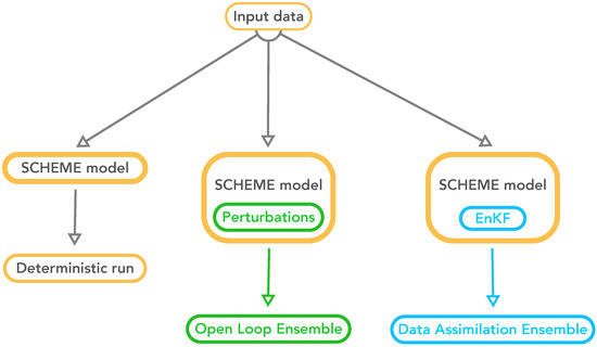 Three different types of experiments were performed with the SCHEME model: the reference or deterministic run, the open loop (OL) and the data assimilation (DA) runs, depicted in Figure 7. The OL and DA experiments produce ensembles of simulated data and can be with or without the bias correction of Section 2.3.3 (not shown in the figure for simplicity).