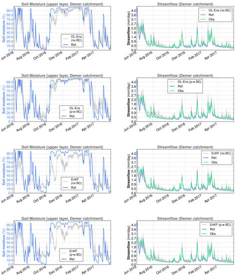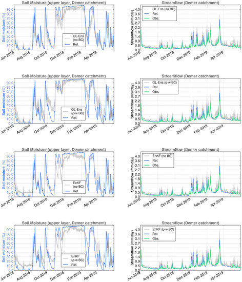 We can have varying results at shorter time scales. For example, during March 2017, we obtained, in the Demer catchment, NSE values equal to 0.833, 0.886 and 0.902 for the reference simulation and the EnKF without and with bias correction, respectively. In this case, although the SCHEME model already performs very well, backscatter DA further improves its performance (even more so with bias correction). In other instances, DA leads to large improvements in the streamflow simulations. This is the case in November and October 2017, with very large increases in model performance in terms of the NSE coefficient: 0.442 and −1.500, respectively, for the reference SCHEME model simulation, compared to 0.819 and 0.603, respectively, for the EnKF average.