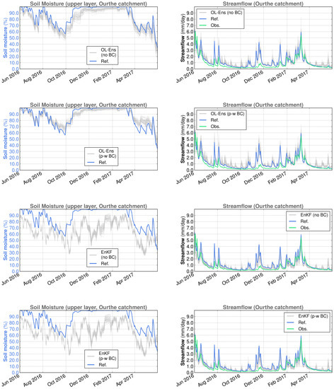 Spatially averaged surface soil moisture (reference simulation and ensemble members) and streamflow (reference simulation, observations and ensemble members) for the Demer catchment in SCHEME model simulations, June 2016–May 2017. From top to bottom: OL without bias correction, OL with piece-wise bias correction, EnKF without bias correction, EnKF with piece-wise bias correction.