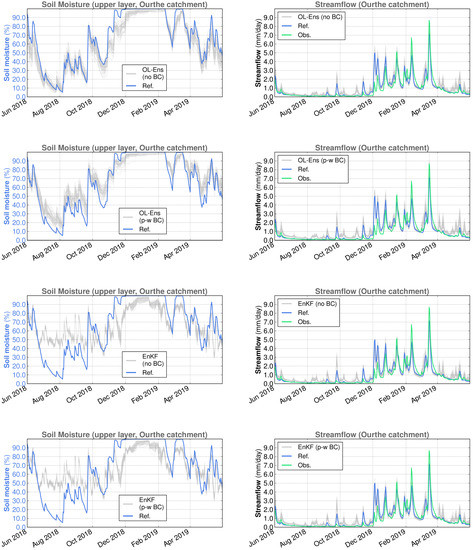 Spatially averaged surface soil moisture (reference simulation and ensemble members) and streamflow (reference simulation, observations and ensemble members) for the Demer catchment in SCHEME model simulations, June 2018–May 2019. From top to bottom: OL without bias correction, OL with piece-wise bias correction, EnKF without bias correction, EnKF with piece-wise bias correction.