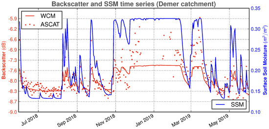 Since the C-band backscatter signal () carries information about the water content of the soil and the vegetation, it can be used directly in a DA system to update the relevant model state variables associated with soil moisture and vegetation. Obviously, such a direct backscatter DA into a hydrological model cannot take place in the same phase space as the model variables, and a specific mapping model is needed as an observation operator.