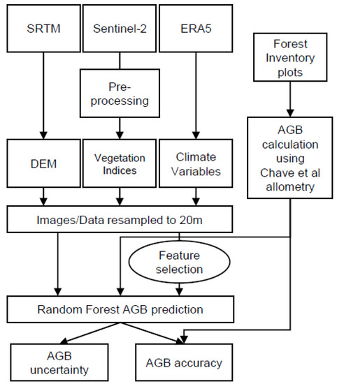 The biomass of each tree within a plot was summed to obtain the total biomass per 400 m2 plot in kilograms (kg/m2) [55]. This is converted to tons per hectare. Figure 2 provides a synopsis of the dataset sources, analytical procedures and final AGB product of the study.