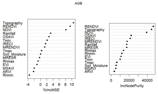 As shown in Figure 3, top parameters that made significant contributions to predicting AGB include topography, rainfall, NDVI, RENDVI, minimum yearly air temperature and OSAVI. For instance, the elimination of topography and RENDVI as a predictive variable reduces the model performance to 55% compared to 85% when all the explanatory variables are included in the model. Conversely, variables, such as minimum relative humidity, ARVI, MSAVI, EVI, maximum relative humidity, MRESR, soil moisture and maximum yearly air temperature, may not have large effects on the model performance as shown in Figure 3. However, as revealed in Figure 3, considering both the %IncMSE and node purity, the important parameters exhibit instability in ranking.