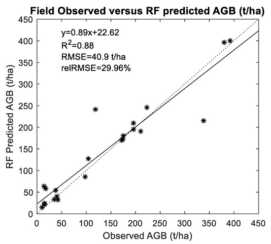 AGB from the testing forest inventory plots were used to determine the predictive accuracy of the final constrained RF model (Figure 4). The scatter plot of observed forest inventory AGB versus predicted RF AGB shows that the observed AGB aligned with predicted AGB with an R2 of 0.88, an RMSE of 40.9 t/ha and a relRMSE of 29.96%. Separating this into 100 t/ha bins, AGB < 100 t/ha is predicted with an RMSE of 21.7 t/ha (66.5% relRMSE/10.1 t/ha bias), AGB between 100 and 200 t/ha is predicted with an RMSE of 47.5 t/ha (29.3% relRMSE/22.8 t/ha bias) and AGB >300 t/ha is predicted with an RMSE of 57.25 t/ha (18.5% relRMSE/−19.3 t/ha bias).
