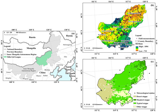 The grass growth season of Xilin Gol League is mainly concentrated in April-September each year, in which August is the peak period of grass biomass [31]. From 2009 to 2015, we collected sample squares from the different grassland types in the administrative scope of the Xilin Gol League in August. To minimize the errors caused by the sample site selection, we selected the grassland communities far from roads or inside fences and those less disturbed by human activities. The spatial distribution of sample collection points is shown in Figure 1b. Sample squares 1 m × 1 m in size were collected evenly in each grassland type. The longitude, latitude and elevation of the samples were recorded, and the above-ground parts of the samples were mowed flush and finally dried in the laboratory to obtain the dry weight of the sample. The data were obtained from years of field measurements at the College of Geographical Sciences, Inner Mongolia Normal University.