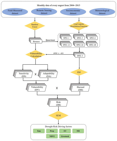 Risk is the likelihood that the interaction of hazards and vulnerabilities will lead to adverse outcomes [23]. Risk assessment can be divided into disaster risk assessment and vulnerability risk assessment [24]. Drought hazard (DH) can be expressed as the probability, frequency, intensity, duration and spatial extent of drought occurrence. Recently, the probability density function (PDF) based on the drought index has been successfully applied to calculate the DH [25]. Climate change and extreme weather events may increase vegetation DR, and the IPCC [26] has shown that DR assessment methods and techniques are receiving extensive attention. Yang et al. [27] used a maximum entropy copula-based frequency analysis method to assess bivariate drought risk in the Kaidu River Basin, China. Yang et al. [28] used sensitivity analysis and other methods to quantify the impact of various climatic factors on the drought risk of winter wheat based on the long-term climate dataset of the North China Plain weather station. However, quantitative evaluation of the DR of different grassland types has rarely been reported. In addition, risk assessment is influenced by the intersection of climatic factors and human activities. Therefore, it is necessary to distinguish human activities from different climatic factors to improve the validity of the assessment. Remote-sensing-based methods allow real-time and effective drought risk assessment of grassland biomass over large areas. An in-depth understanding of the intrinsic relationship between grassland vegetation dynamics, climate change and human activities is important for predicting future grassland biomass trends.