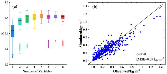 In this paper, eight factors (Tem, Prcp, SM, Lon, Sand1, NDVI, FVC and EVI) that may affect the estimation of grassland biomass were selected from the aspects of meteorological, soil and vegetation factors. The random forest algorithm was used to improve the accuracy of model estimation by gradually increasing the number of input variables and the combinations between variables. The accuracy of the models established by different input variables is shown in Figure 3a. The accuracy of the model improved significantly with an increase in the number of input variables. The highest model accuracy was achieved when four variables were input. In this study, the corresponding input variables were NDVI, Prcp, SM and Lon, and the model accuracy is shown in Figure 3b, as R = 0.90 and RMSE = 0.09 kg/m2. With further increases in the number of input variables, R remained between 0.88 and 0.89, without significant improvement in model accuracy. Based on the principles of high model accuracy, low input parameters and ease of use, NDVI, Prcp, SM and Lon were selected as the input variables for establishing a grassland biomass estimation model and performing spatial inversion of the grassland biomass.