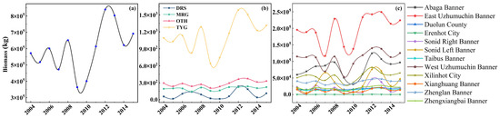 (a) Interannual variation in grassland biomass overall; (b) annual changes in biomass of different grassland types; (c) annual changes in grassland biomass by banner and county.
