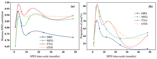 (a) SPEI and biomass correlation across multiple SPEI time scales; (b) positive correlation area ratios across multiple SPEI time scales.
