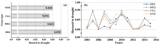 The spatial distribution of grassland biomass drought hazards is shown in Figure 8. Over time, the area and scope of the drought suffered by the grassland of the Xilin Gol League have changed. Sunit Left Banner and Sunit Right Banner were the regions with the highest frequency of drought disasters over the 12 years, and the frequency of drought disasters in East Urumqi, West Urumqi and Abaga Banner was low. Figure 9a shows that the drought disasters of different grassland types were not significantly different, and the DH was concentrated between 0.83 and 0.85. The degree of drought of the various grassland types was in the order of: DRS > MEG > OTH > TYG. The temporal variations in drought hazards in different grassland types are shown in Figure 9. The drought hazards of various grassland types showed fluctuating changes. Various grassland types suffered severe drought disasters in 2005, 2007, 2010 and 2014, but fewer drought hazards in 2004, 2006, 2008 and 2013.