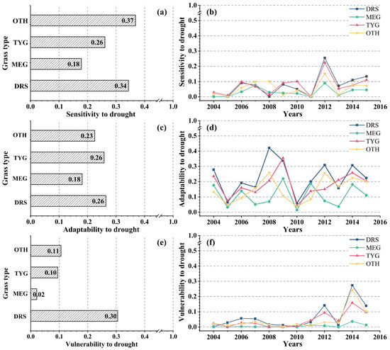 (a,c,e) Average annual changes in drought sensitivity, adaptation and vulnerability of different grassland types, respectively; (b,d,f) annual values of drought sensitivity, adaptability and vulnerability of different grassland types, respectively.