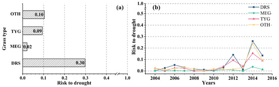 The numerical distributions of drought risk and vulnerability were relatively similar (Figure 11). DRS drought risk was the highest, with a DR of 0.30, while OTH and TYG were comparable in risk. The minimum drought risk was 0.02 for MEG. Figure 11b shows that drought risk was relatively low for all grassland types until 2011, fluctuating between 0 and 0.06, while 2012 and 2014 were two peak periods for various grassland drought risks, followed by a gradual recovery.