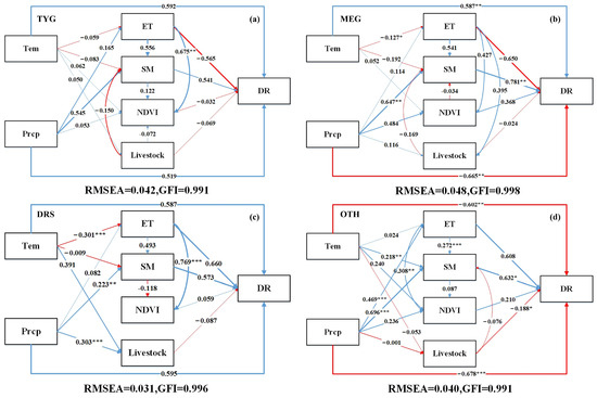 Structural equation modeling the effects of the Tem, Prcp, SM, ET, NDVI and Live factors on the control of DR. Blue and red arrows represent the positive and negative relationships, respectively. The number and the line thickness of each path represent the path coefficients. RMSEA, root mean square error of approximation; GFI, goodness-of-fit index. *** p < 0.001, ** p < 0.01, * p < 0.05. (a) TYG, (b) MEG, (c) DRS, (d) OTH.