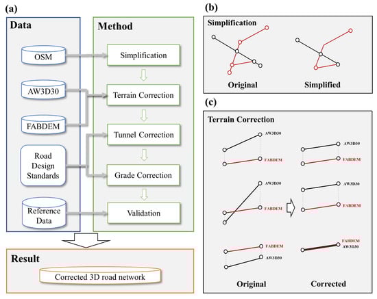 (a) Workflow diagram for extracting 3D road networks, (b) The detailed process of simplification, (c) The detailed process for terrain correction.