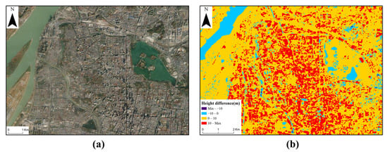 In the previous study, we found that the elevations of some nodes in the AW3D30 DSM data are underestimated at high values and overestimated at low values [48]. Urban land surface would be lower than DSM in most built-up areas in our perspectives. To verify it, we use the results of AW3D30 DSM minus FABDEM via the Raster Calculator in ArcGIS to assess it. The result is reclassified into four categories, where the warm tones represent areas where the elevation of DSM is greater than that of DEM, and the opposite applies for cool tones. Figure 5 shows that the elevation values of AW3D30 DSM are greater than those of FABDEM in most pixels, whilst the minus values are generally found in such locations as rivers and lakes. According to visual interpretation, the values of AW3D30 DSM in most road segments are slightly greater than those of FABDEM, but a huge difference is found in building areas. Given that AW3D30 DSM has been evaluated worldwide and obtained good accuracy, the outcomes by our raster calculation indicate that FABDEM is suitable as a land surface elevation data source of AW3D30 DSM.