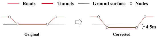 Given that AW3D30 DSM is a product of photogrammetry, the sensors cannot completely detect the essential parts in a 3D road network, especially tunnels. Thus, the correction for tunnels is performed based on the previous simplification and terrain correction. We check the tunnel construction standard adopted and published by the American Association of State Highway and Transportation Officials in the USA [55] and determine that the minimum height of tunnels cannot be lower than 14 feet, i.e., 4.26 m. Though the technical standard for highway engineering in urbanised areas (JTG 2112–2021) issued by the Chinese Ministry of Transportation [56] does not specify the height limitation for tunnels, it states that for expressways, first-class roads and other high-level roads, the height limit for vehicles is 5 m, and that for the other road segments is below 5 m. Considering the regional variability of this criterion and global suitability of our approach, we combine the two standards and calculate the mean tunnel height. To facilitate the calculation, the tunnel height was set to 4.5 m generally. In our software, users could modify this variant for local urban cases and standards. Through OSM, we can quickly query tunnel sections’ distribution by road data attributes. Based on the result of the previous workflow, the elevation of the nodes at each end identified as tunnel sections is lowered by 4.5 m. Figure 6 shows the detailed process for the tunnel correction process. As a result, the original tunnel nodes over the terrain surface were corrected to below the ground and the tunnel sections were reconstructed.