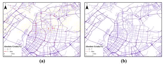 The spatial distribution of absolute grade (a) in the uncorrected road network; (b) in the corrected road network.