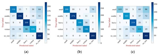 Based on the performance in different rainfall scenarios, the classification results of PNNAMMS have been compared with the five best-performing alternative models using a confusion matrix (Figure 6). As Figure 6 shows, PNNAMMS had a classification accuracy for “small” of 77.27%, “middle” of 94.40%, “heavy” of 86.69%, “violent” of 66.66%, and “no_rain” of 97.19%; thus, it achieved excellent classification performance in the categories of “middle”, “heavy”, “small,” and “no_rain”. In addition, note that the classification accuracy for “small” of PNNAMMS was higher than that of the other models. Specifically, the accuracy of PNNAMMS was 21.08% higher than that of CNN [], 6.09% higher than that of five-stack CNN [], 41.50% higher than that of DS-CNN [], 18.69% higher than that of MRNet [], and 12.93% higher than that of RACNN []. With the fusion of different scales, our model was more robust than other networks.