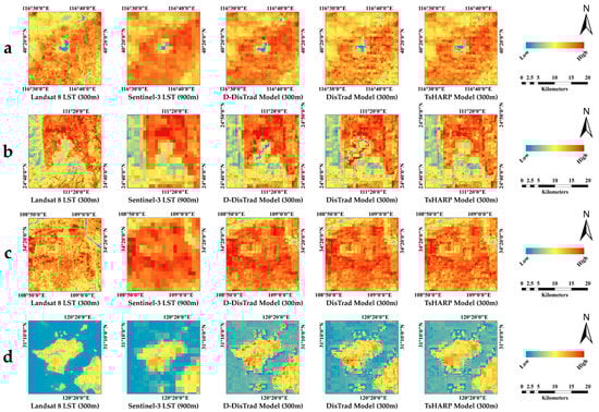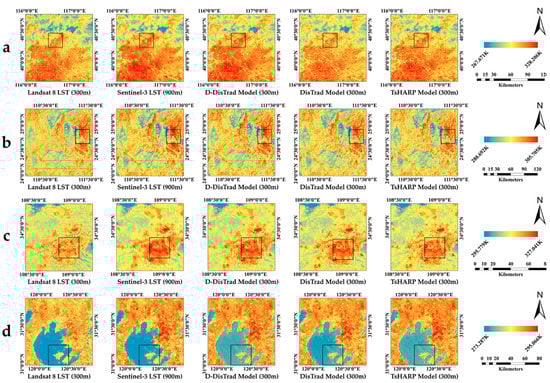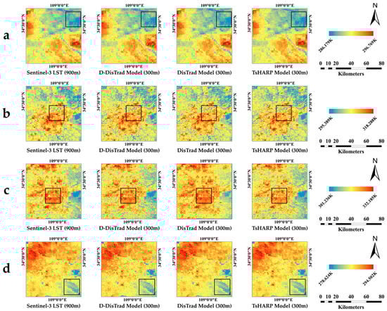 Each line goes from left to right, showing the Landsat 8 LST, SLSTR LST, D-DisTrad LST, DisTrad LST, and TsHARP LST data for the 4 study sites: (a) site 1, Beijing; (b) site 2, Guilin; (c) site 3, Xi’an–Xian Yang; (d) site 4, Taihu River Basin. The black box shows the selected areas of noticeable change.