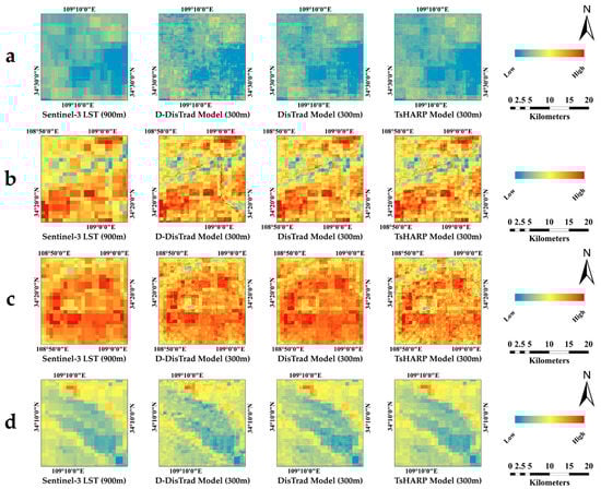 Finally, the research in this paper is dedicated to the following objectives: (1) Aiming at addressing the problems with the existing LST downscaling model, and improving the model, a new downscaling model, D-DisTrad, is proposed. (2) We qualitatively and quantitatively evaluate the effects of the D-DisTrad model proposed in this paper in different locations and seasons, to prove that the model proposed in this paper has a better effect and can effectively compensate for the deficiencies of the existing models. (3) We analyze the downscaling results of the D-DisTrad model, exploring the sources of model errors and ensuring the rigor and persuasive application of the model.