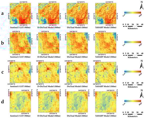 - The SLSTR sensor’s excellent temporal resolution enables it to capture images not only during the day but again at night on the same day. Therefore, two LST data scenes—one for the day and one for the night—can be generated in a single day. If it is considered that the topography and land cover of the study sites are unchanged on the same day, D-DisTrad can also be used to generate nighttime LST downscaling data, which are of great significance and have good prospects for studying the changes in day and night LST data and for related research under long time series.