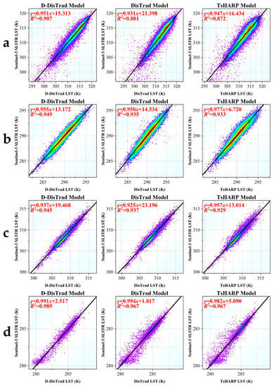 Firstly, for the study of four sites, the data in Table 5 shows that the D-DisTrad model achieved the optimal results for almost all indicators of the four sites (only two sites did not achieve optimal MB values and were suboptimal). For the MB indicator, the D-DisTrad model works better with the DisTrad model, and the TsHARP model works most generally. The MB errors of the three downscaling models are basically less than 0.2 K. The errors of the D-DisTrad model are less than 0.03 K, and the smallest is even −0.001 K. In terms of the MAE and RMSE, the D-DisTrad model achieved the best results. The MAE is within 1 K, the maximum is 0.891 K, and the minimum is 0.103 K. The maximum RMSE is 1.235 K, the rest are less than 1 K, and the minimum is 0.220 K. As for the two indicators, PCC and , the D-DisTrad model also has the best results for downscaling in the experiments across the four sites, with values above 0.900, all of which have an extremely strong correlation and a high fitting accuracy (Figure 9 also shows this). The PCC is 0.994 for the highest and 0.952 for the lowest. The highest is 0.989, while the lowest is 0.907. The results show that in the study sites selected in this paper, with different geographic, climatic, topographic, and economic conditions, the LST downscaling results generated by the D-DisTrad model have smaller errors and a higher correlation and fitting accuracy than the other two downscaling models. It has the best retention effect on the original Sentinel-3 SLSTR LST images and can ensure a more accurate description of the actual LST values after downscaling, which is more valuable for related studies using these LST data.