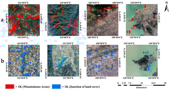 The representative areas with errors greater than 1 K in four study sites were selected from site 1 to site 4 from left to right: (a) mountain areas with errors greater than 1 K; (b) junction of land cover types with errors greater than 1 K.