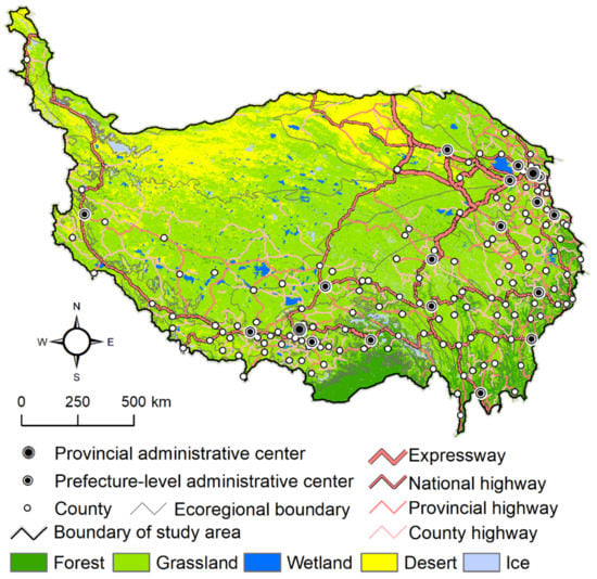 There are 27 ecoregions, 10 national key ecological function zones, 46 national nature reserves and 4 national parks on the TP (Figure 1). According to incomplete statistics by the International Union for the Conservation of Nature [], there are at least 1714 species on the TP, including 388 species of mammals, 1050 species of birds, 117 species of reptiles and 159 species of amphibians.