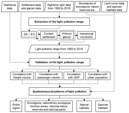 This study aimed to analyze the spatiotemporal patterns of LP and its impacts on the TP based on the GHNTL nighttime light data. First, we quantified the distribution and dynamics of LP on the TP during 1992–2018. We quantified LP at four scales: ecoregion, national key ecological function zone, national nature reserve and national park. Second, we analyzed the effects of LP on various natural habitats and habitats of different species on the TP. Then, we analyzed the reasons for LP and gave policy suggestions to deal with LP on the TP.