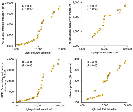 LP area is significantly correlated with various socioeconomic indicators (Figure 3). Correlation coefficients were all above 0.8 and passed the significance test of 0.001. The correlation coefficient between LP and GDP in secondary and tertiary industries is the highest (R = 0.89), followed by freight volume (R = 0.88), passenger volume (R = 0.84) and urban population (R = 0.82).