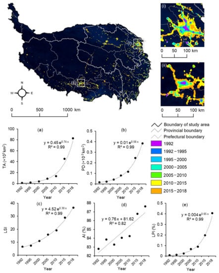 First, referring to Liu et al. [], the landscape indices were used to quantify the spatial pattern of LP on the TP during 1992–2018. We selected total area (TA), patch density (PD), landscape shape index (LSI), aggregation index (AI) and largest patch index (LPI). PD refers to the number of patches per unit area, reflecting the degree of fragmentation or dispersion of light-polluted areas. The LSI is the normalized ratio of the patch perimeter to the patch area, which is an index used to measure the shape complexity of LP patches. The AI measures the concentration of LP patches. The LPI is the largest polluted patch on the entire TP. All indices were calculated by Fragstats software (V4.2) [].