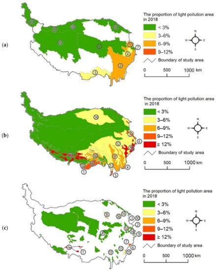 All 10 national key ecological function zones on the TP were affected by LP, and four of them were affected by LP of more than the average level of LP on the TP in 2018 (Figure 5b and Figure S2). These were the ecological function zone of the Gannan Yellow River water supply (No. 1 in Figure 5b), the forest and biodiversity in Sichuan and Yunnan (No. 2), the forest at the margin of the plateau in southeastern Tibet (No. 3), and the Zoige Grassland Wetland ecological function zone (No. 4). These national key ecological function zones were all located in the southeast of the TP. The national key ecological zones in the northwest of the TP were less affected by LP.