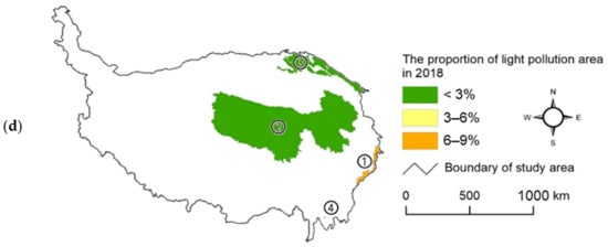 In this study, the spatial-temporal pattern of LP on the TP during 1992–2018 was determined based on remotely sensed nighttime light data at multiple scales. The impacts of LP changes on natural habitat and species habitat were analyzed, therefore helping to fill the gap in the field of LP research on the TP. In the previous studies, Koen et al. [] assessed the global LP from 1992 to 2012, while Li et al. [] evaluated the LP for natural reserves in China in the same period. They both found that TP had relatively low LP between 1992 and 2012. However, the previous studies did not measure LP on the TP after 2012 in light of the inconsistence in NTL data. This study provided an assessment of LP over the past three decades based on the harmonized NTL data, and found that the LP had increased widely since 2012, posing threats to natural habitats and species habitats on the TP.