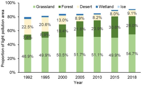 Finally, referring to Koen et al. [], He et al. [] and McDonald et al. [], we quantified the impacts of LP on biodiversity on the TP during 1992–2018 based on spatial overlay analysis and statistical analysis of the LP range with different types of natural habitats and species habitats. To understand the effects of LP on natural habitats, we calculated the area of LP that overlapped with each type of natural habitats and calculated the proportion of this area to the total area of LP range year by year. The effects of LP on the habitats of different species were quantified from two aspects: one is the number of species with potential habitats affected by LP (i.e., species whose habitats overlap with LP areas), and the other is the proportion of light-polluted habitat area of the species. Additionally, the endangered species with high proportion of light-polluted habitat area were identified. To highlight key messages, we selected the LP range at seven milestones (1992, 1995, 2000, 2005, 2010, 2015, and 2018) from annual LP range between 1992 and 2018 for the above analyses.