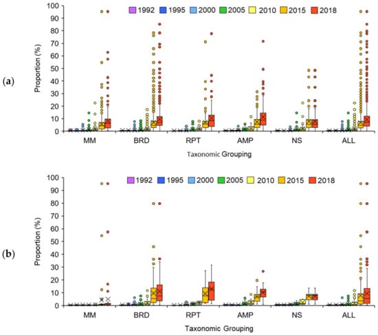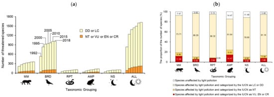 In addition, the number of endangered species with habitats affected by LP also increased year by year (Figure 7a). In total, the number of endangered species with habitats affected by LP increased from 89 to 228, an increase of approximately 1.5 times. The number of mammals affected increased 1.1 times, birds 1.6 times, reptiles 3.5 times, amphibians 2.8 times, and nocturnal animals approximately 2.7 times. Birds had the largest number of endangered species with habitats affected by LP (Figure 7a), while amphibians had the largest proportion of endangered species with habitats affected by LP (Figure 7b).