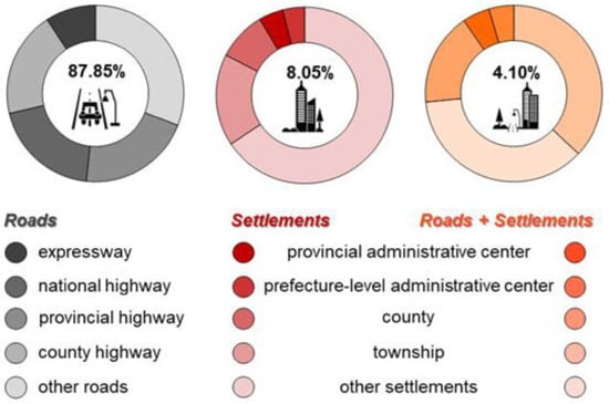 LP on the TP mainly occurs along traffic routes and around towns (Figure 1 and Figure 4). We further conducted attribution analysis on the expanded range of LP on the TP from 1992 to 2018. Specifically, we analyzed the main sources of LP according to the distance of LP pixels from roads and settlements and LP pixels that had equal distances to roads and to settlements to the joint effects of both. The results show that the LP on the TP during 1992–2018 was mainly attributed to the influence of roads, accounting for 87.9% of the total area of new LP (Figure 9). In addition, 8.1% of the LP area was attributed to settlements. A total of 4.1% of the LP area was attributed to the combined influence of roads and settlements.
