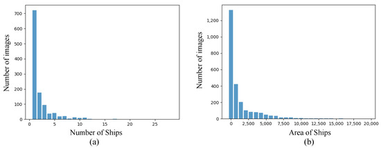 Statistics of the SSDD dataset. (a) is the number of images with regard to the number of ground-truth ships. (b) shows the number of ships with regard to the area of ground-truth ships.