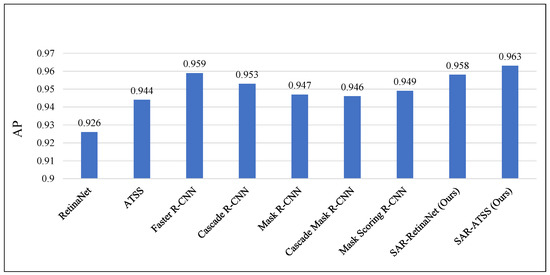 The trials presented in the previous sub-sections solely relied on FCOS. Hence, we validate our methods’ broad applicability in this sub-section by combining it with RetinaNet and Adaptive Training Sample Selection (ATSS) [48]. While FCOS is an anchor-free one-stage detector, RetinaNet is anchor-based, and ATSS adopts an advanced label-assigning strategy. Because RetinaNet and ATSS leverage different label-assigning strategies that are probably more suitable in SAR ship detection tasks, therefore, their baseline performances are higher than FCOS. On these detectors, we apply both the light head/FPN and BoxPaste, while in any case, ResNet-50 is the backbone model. The corresponding experimental results are presented in Table 4, highlighting that RetinaNet and ATSS attain 92.6% and 94.4% AP, far better than FCOS (90.8% AP). Possibly due to RetinaNet being an anchor-based detector, while ATSS uses an advanced label-assigning strategy. Both detectors increase the number of positive training samples per mini-batch. Nevertheless, using the light head/FPN still improves their AP by 0.7% and 0.5%, respectively. After adopting BoxPaste, the detection performance is further improved to 95.8% and 96.3%, respectively, validating the applicability of our proposed methods on different detectors. The new detectors, i.e., SAR-RetinaNet and SAR-ATSS, are compared against other state-of-the-art SAR ship detectors on SSDD, utilizing ResNet-50 as the backbone network. The counterparts include one-stage detectors, such as ATSS, as well as powerful two-stage detectors, such as Faster R-CNN and Cascade R-CNN. The results in Figure 7 show that SAR-ATSS achieves 96.3% AP, surpassing all other previous work.
